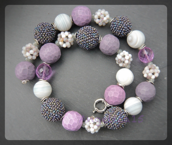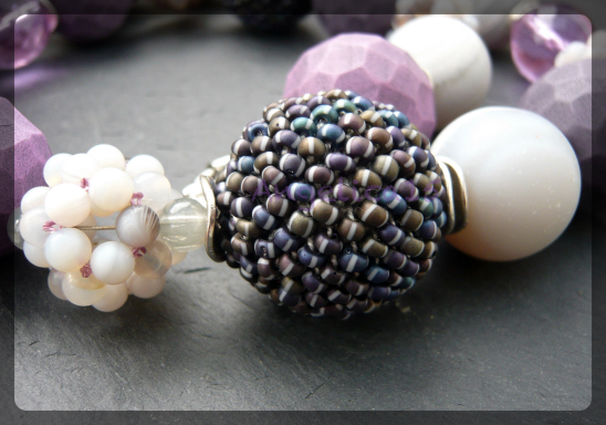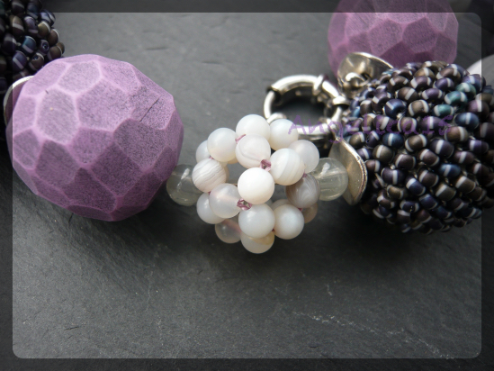 Mir war schnell klar, was daraus werden sollte, also begann die Suche nach passenden Perlen. Bei Etsy hab ich mir von einer Polymer Clay Künstlerin ein paar Hohlkugeln machen lassen, dann hatte ich noch alte  gestreifte CzechRocailles mit tollem Glanz. Gefädelt allerdings sahen die nicht so doll aus, es wurde immer krumpelig, also hab ich fix ein paar Kugeln gehäkelt.