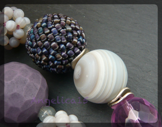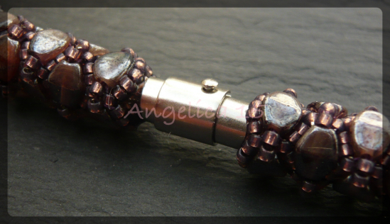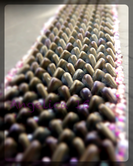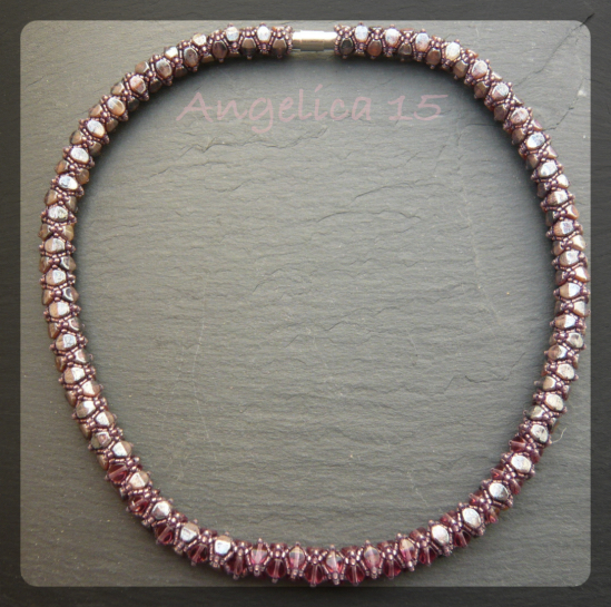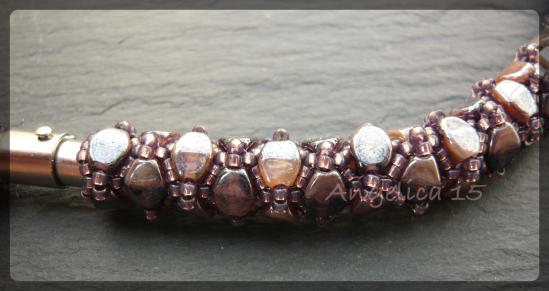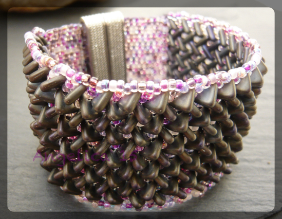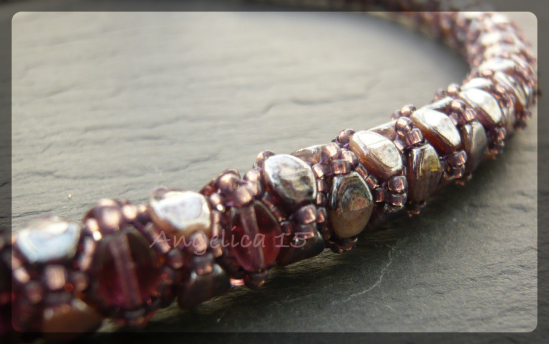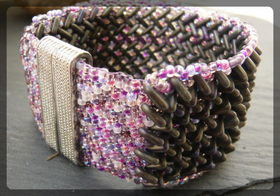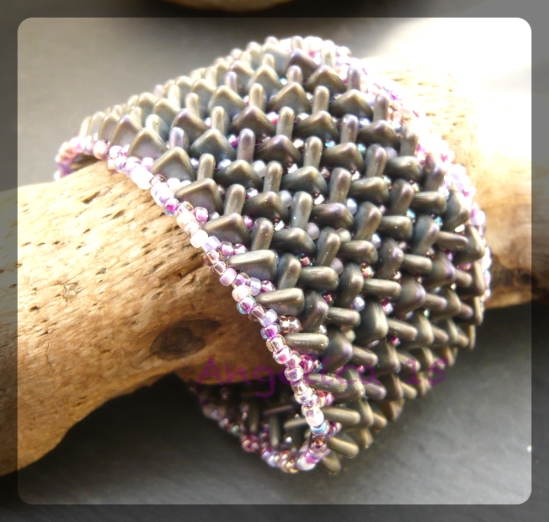 ist und bleibt meine Lieblingstechnik.  Das hier hatte ich jetzt schon eine Weile im Kopf und nun hatte ich endlich die passenden Triangel gefunden. Ich habe Doppellochtriangel mit normalen 11ern verherringboned und das kam raus. Was für eine schöne Optik. Und Haptik. Und ich bin auch endlich was von dem Passionsblumenmix von Miyuki losgeworden...