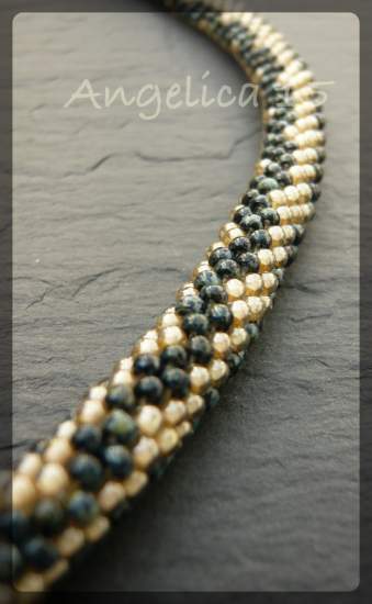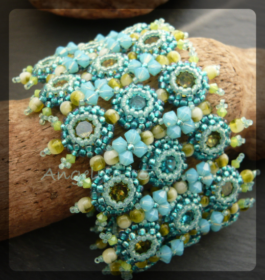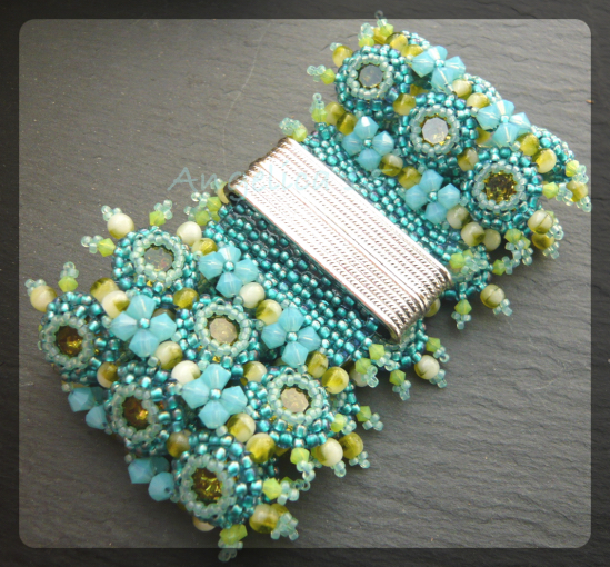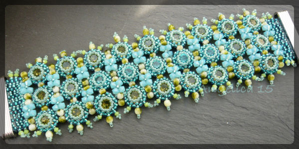 die türkisen Chatons in der Mittelreihe kommen übrigens daher, das die angegebene Menge 14 cm Länge ergeben hätte. Aber Khaki hatte ich nicht mehr, deshalb hab ich die Indigoliths mit reingenommen.
