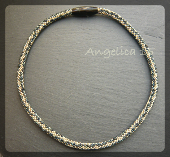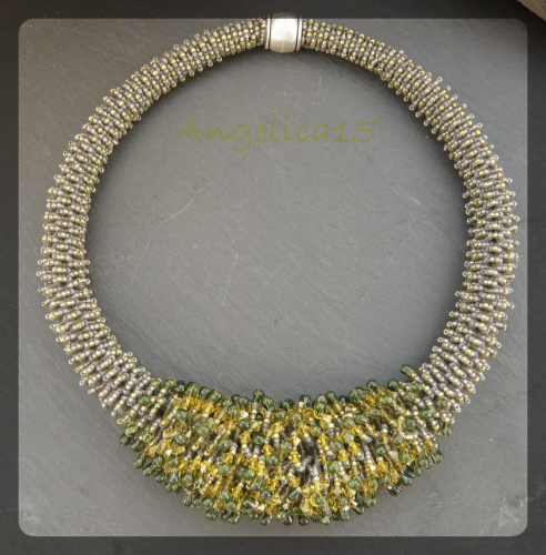 aus gegebenen Anlass hab ich mich durchgerungen und endlich die Lekku gefädelt. In 650 und 991, mit Swaros in Khaki und Lime im Verhältnis 1:2 und grün-schwarz gestreiften Drops. Ein wenig enttäuscht bin ich vom Gewicht, 141 Gramm , da hab ich mehr erwartet. Sie trägt sich wie nichts, man merkt sie nicht...