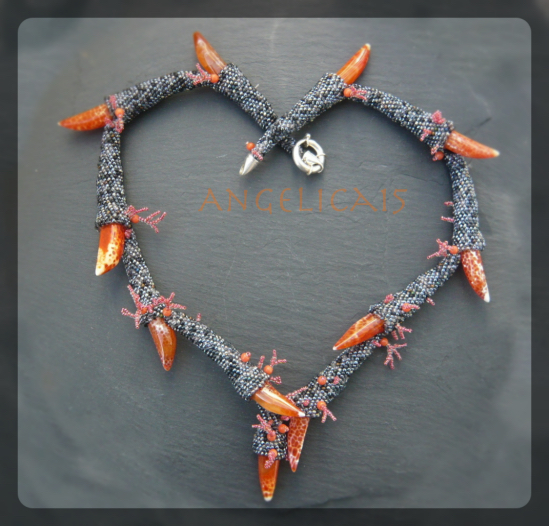 Am Anfang stand die Kette einer Russin, die in gehäkelte Ketten Löcher eingehäkelt hatte, in die dann runde Kugeln eingefädelt wurden. Letztes Jahr hab ich mir dann im Oktober zum Jahresurlaub eine Suppe angesetzt aus Hematit, Hybriden,  Jet Azzuro, und anderen wunderbaren dunkelgrauen Farben. Und dann im Urlaub drauflosgehäkelt. Allerdings hatte ich da noch die Idee, Korallenäste zu bündeln und danach einzufädeln ( kommt vielleicht noch) oder aus Polymerclay was zu basteln. Und dann kam ich aus dem Urlaub zurück mit der Kette, drei Tüten lang ( der Urlaub war voll gewesen) und der Zufall kam mir Hilfe. Bei Etsy hab ich diese Achatzähne entdeckt, gekauft und - als sie kamen- eingepasst. Sah genau richtig aus. Und dann halt wieder ein bisschen gehäkelt und so weiter und so fort. Und als alles fertig war, wirkte es doch ein wenig .... TUSK.