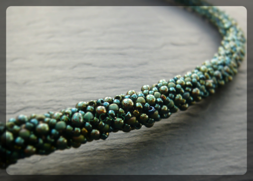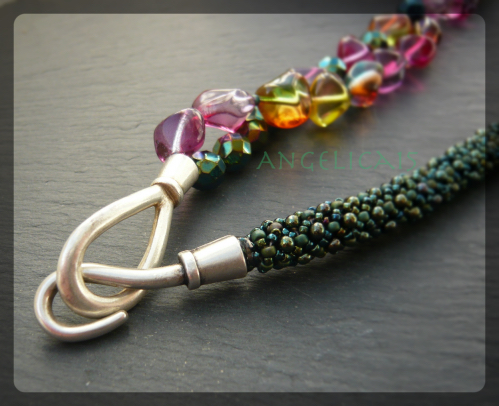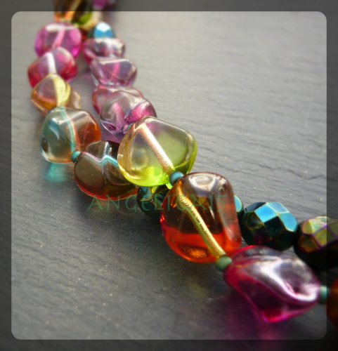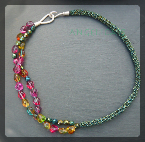ein hübsches ausgetüfteltes Kettenmuster mit Glasnuggets in Turmalinfarben. Und zwar allen möglichen.