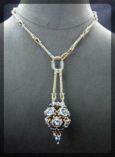 wieder eine Gelegenheit mehr, meine wunderschönen Grau-blauen Vintage Czechsteine zu verarbeiten. Ich lieb die ja sehr und zusammen mit meinem LieblingsGoldbraunton ein Traumstück. Ursprünglich als lange Kette gedacht hab ich sie jetzt mit Verlängerungskette gefädelt, sodass Sie entweder als 50cm Kette zu tragen ist , wie auf der Büste, oder eben laaaang baumelnd. Die Kette hab ich passend zur Kugel nach alten Silberkettenmustern als Vorlage gefädelt.