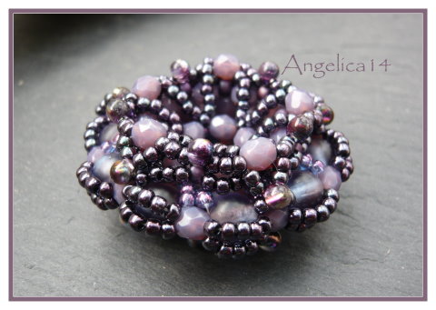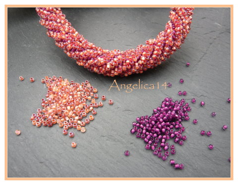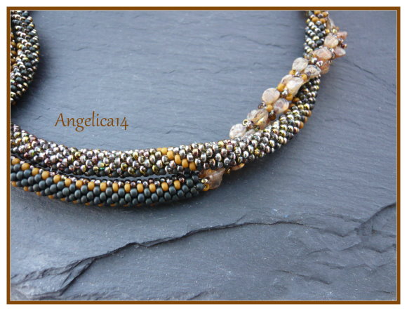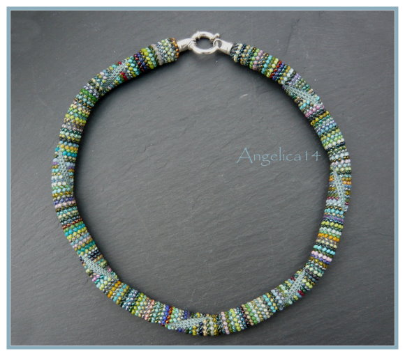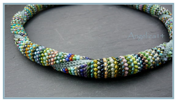 Die letzten zwei Sachen waren diese, eine gehäkelte Kette mit Delicas, das erste Mal mit festen Maschen und kleinem Trick für die Drehung. Und eine einfache Olive in grau transparent ab, das Garn macht es rosig.