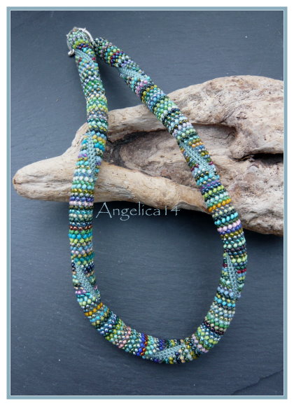 wollte ich ja schon lange. Nur ohne diese Perlenlinie. Jetzt also mit fester Maschenlinie. Und obwohl ich mich auf eine frei Auswahl aus meinen Türkis- , Blau- Gelbgrün-, Naturgrün-, Nichtnaturgrünkisten und abwechselnd aus der Blaulila-, Rosa- , GelbOrangeRotkiste beschränkt hatte (also blieben graue, weiße, schwarze, beige, braune, kupfrige Töne draussen), ist es doch recht bunt geworden. Ich habe extra einen vergleichsweise dickes Garn genommen, 20er, damit der Streifen sichtbar wird und die Kette nicht nach innen kippt, das wollte ich hier nicht. Dadurch war es auch extra flott weggehäkelt.