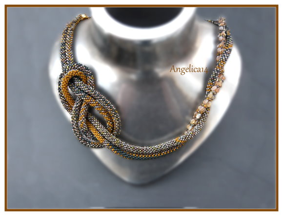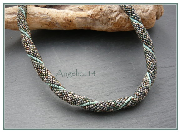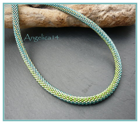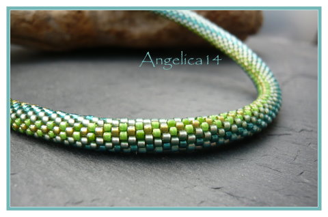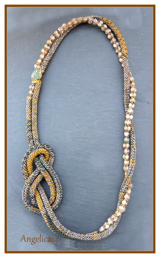 hat auch nicht zu lange gedauert. Ich fand diesen Knoten sehr schön, die Idee, das dann mit Pinches zu verbinden war schon letzten Sommer da, die Kette war letzten Oktober fertig und dann waren die Pinches weg, die ich im Kopf dazu ausgesucht hatte. Immer mal wieder gesucht, aber ohne Ergebnis. Jetzt war es dann soweit, Perlen da, Kette fertig, Collier abgeschlossen.Nur die Fotos sind im Moment verbesserungswürdig. Aber wir tragen ja keine Fotos, sondern die Kette... Das ist das wunderbare Magic Green zusammen mit den Tohos in iris grün gefrostet ( einer meiner Lieblinge) und erbsensuppengelb gefrostet. Dazu die großartigen Pinches, die wirklich farblich passten wie Topf/Deckel.
