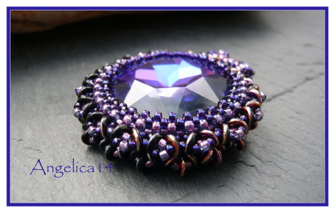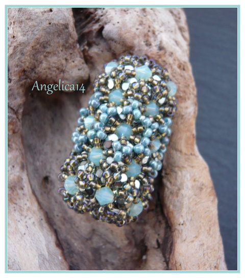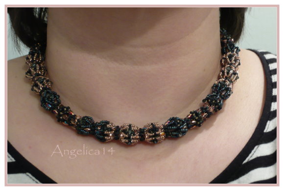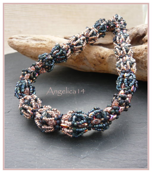 Als die Popper in den frühen 80ern hoch kamen, liefen sie ja eher pastellig rum, zum Ende der 80er gab es fast nur noch eine Farbkombi: Navyblau mit (Rose) Gold . Ich hatte die ganze Zeit beim fädeln so etwas wie Human League oder Spandau Ballet im Kopf. Das ist die Oxanna von Ewa. In Sliperit und Dunkelblau und Kupfer. Und damit das nicht so eintönig gleichmäßig wird, hab ich das Belegen variiert.