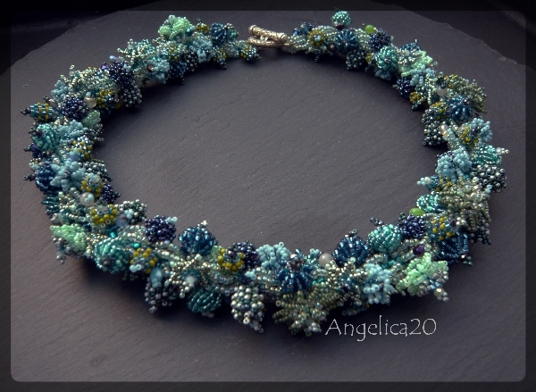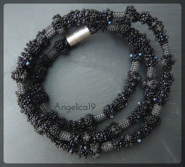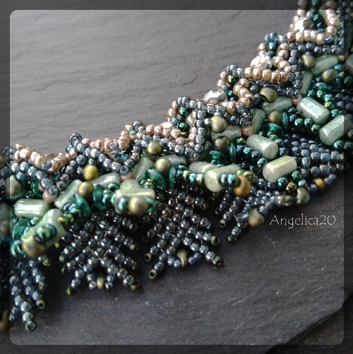 Zudem hatte ich schon seit Jahren die Vorstellung ein mehrlagiges Collier zusammen zustellen, da bot sich die Aztek als Basis an. Ich hab dann erstmal mit St.Petersburg darunter gefädelt und dazu analog dann oben noch eine Lage . Das musste allerdings auf der Büste gefädelt werden, damit die Rundung a Hals stimmt, sonst hätte sich das Ganze aufgestellt. Aber so ist gut.
