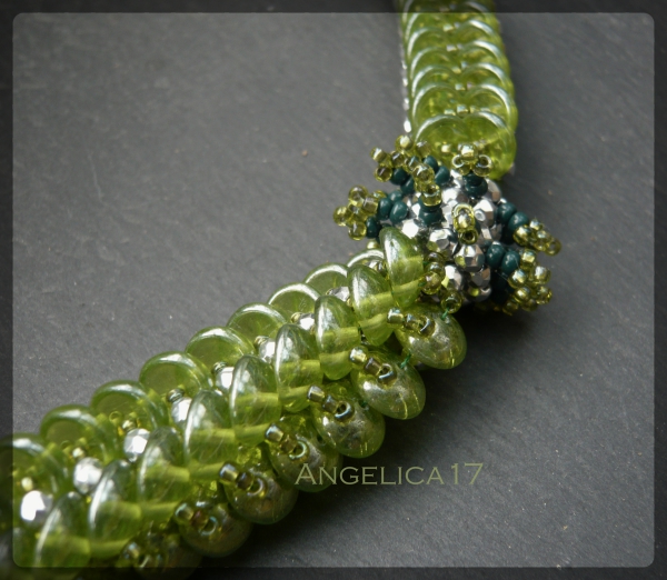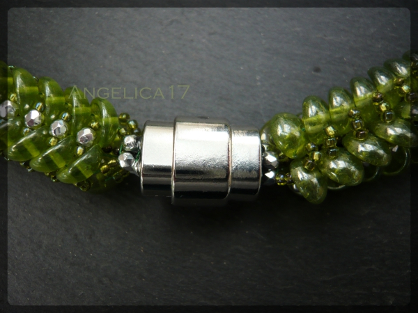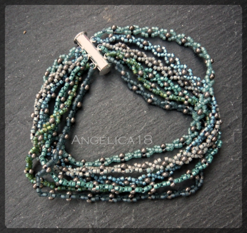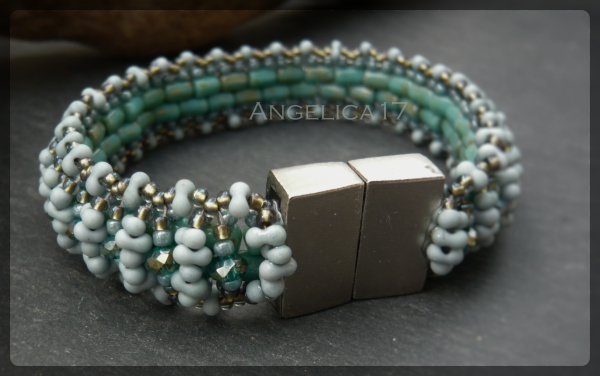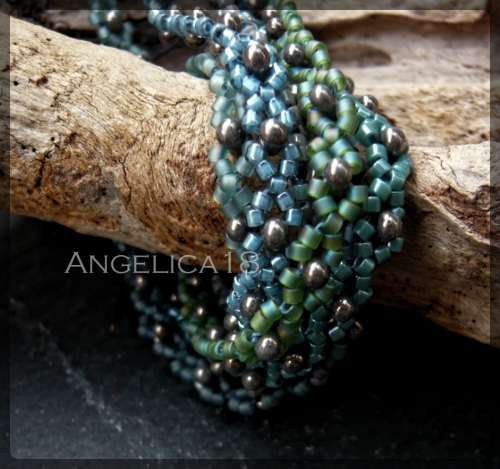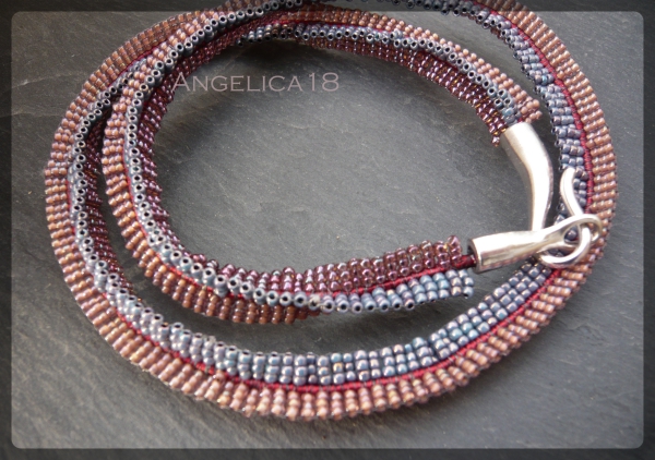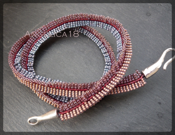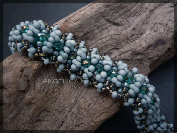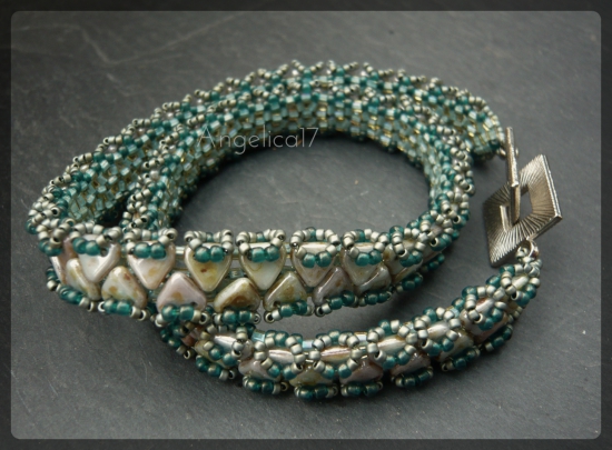 eigentlich nur eine Armbandidee, aber für mich normal zu schmal und fipsig. Deshalb habe ich es doppelt gearbeitet und als Wickelarmband gefertigt.