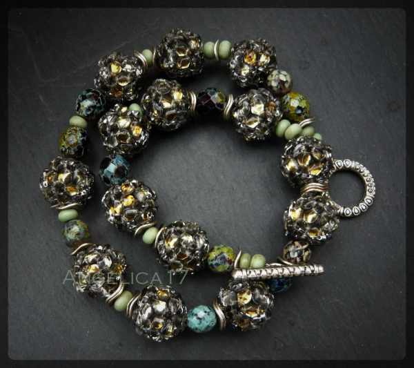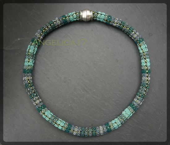 Die Kette sollte die Farbe wirken lassen, aber ich wollte eine Glanzreihe drin haben. Jetzt bin ich nicht der MeshFreund, zu kratzig und zu laut im Auftritt. Drops wären zu wenig gewesen. Und 2mm Cubes in Crystal Silverlined, mattiert, wirken genau richtig.