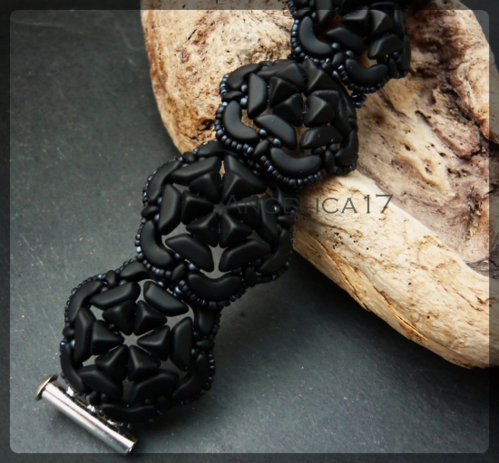 einzelne Rosetten zu einem Armband zusammengefügt, alles in mattschwarz und für das Quäntchen Extra etwas übereinander geschoben.